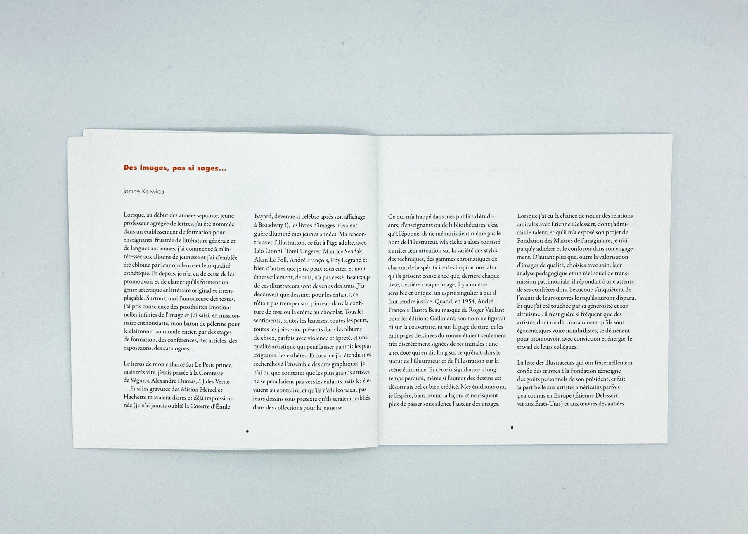 À l’occasion de l’exposition présentée à la Médiathèque André Malraux, ce fascicule a été conçu comme le prolongement naturel de la manifestation. Il rassemble les noms des artistes invités — Marshall Arisman, Gilles Bachelet, Jean-Louis Besson, Guy Billout, Ivan Chermayeff, Seymour Chwast, Jean Claverie, Étienne Delessert, Christopher Dunn, Heinz Edelmann, Stasys Eidrigevicius, Randall Enos, Monique Félix, André François, Henri Galeron, Roberto Innocenti, Gary Kelley, Claude Lapointe, Alain Le Foll, Georges Lemoine, David Macaulay, James McMullan, Sarah Moon, Yan Nascimbene, C.F. Payne, Jerry Pinkney, Eleonore Schmid, Chris Sheban et David Wiesner — et témoigne de la richesse des regards réunis pour l’occasion.